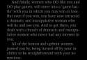 A high dose would be, a wife wanting another kid and the husband doesn't. Her gameplan "is too become standoffish, don't cook, don't clean, and no sex until he's caved in.