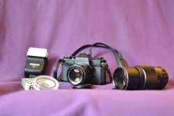 It's a Spotmatic II with a 1.4/50mm lens, a 200mm Mamiya/Sekor lens, a flash gun (that still works and also with my D3100!), a tripod, "soft filter" and some various cleaning stuff that is years old.